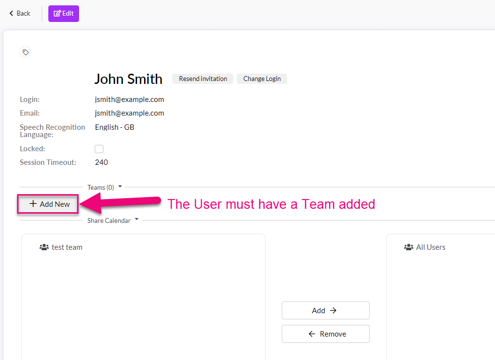 - The User has now been created and you need to give them permission to use CRM by assigning them to a Team – click on the Add New button to reveal a list of Teams to select from.
