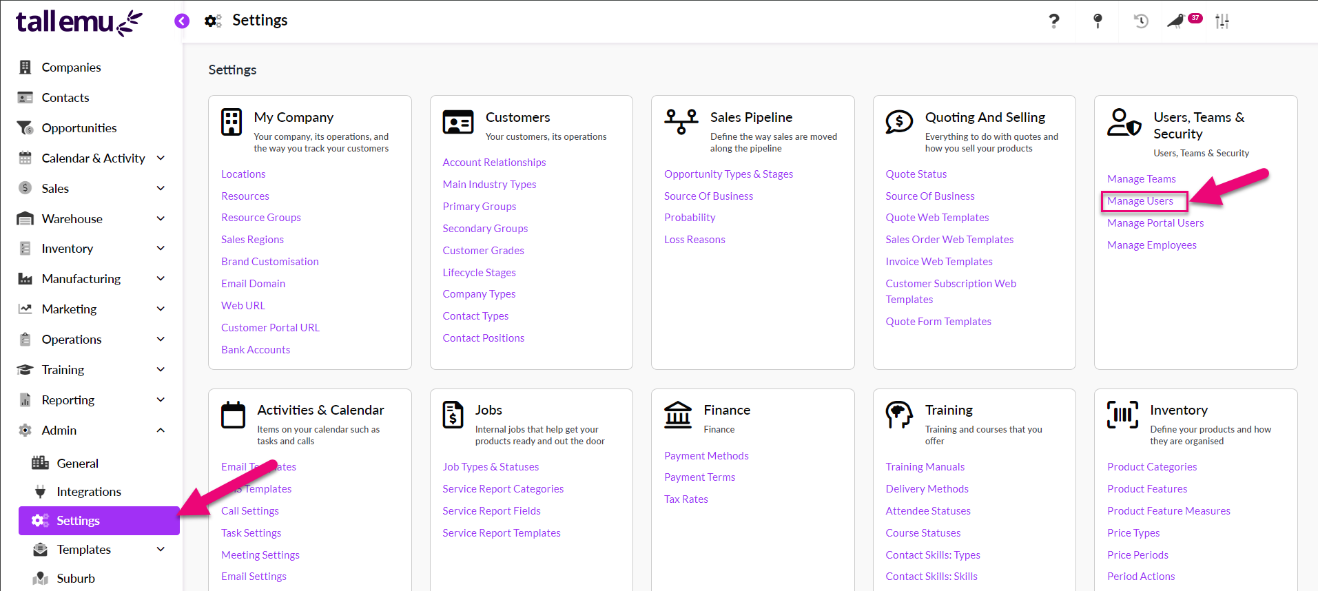 - Go to Admin > Settings > Users, Teams & Security and click on Manage Users.