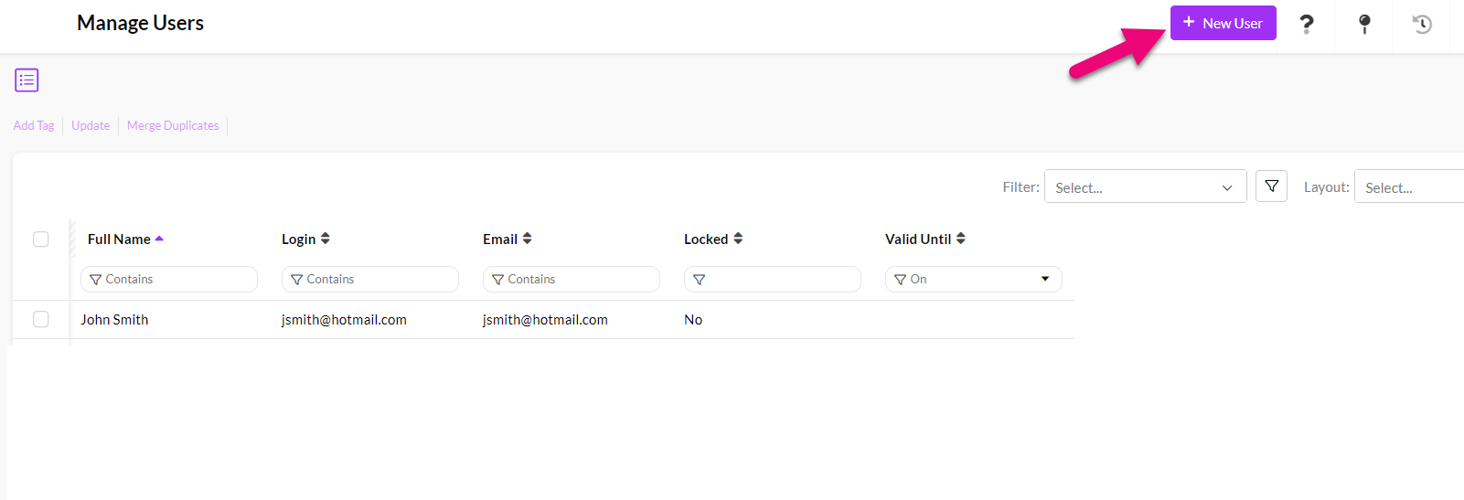 - You will be taken to the User management area of CRM – just click on New User.