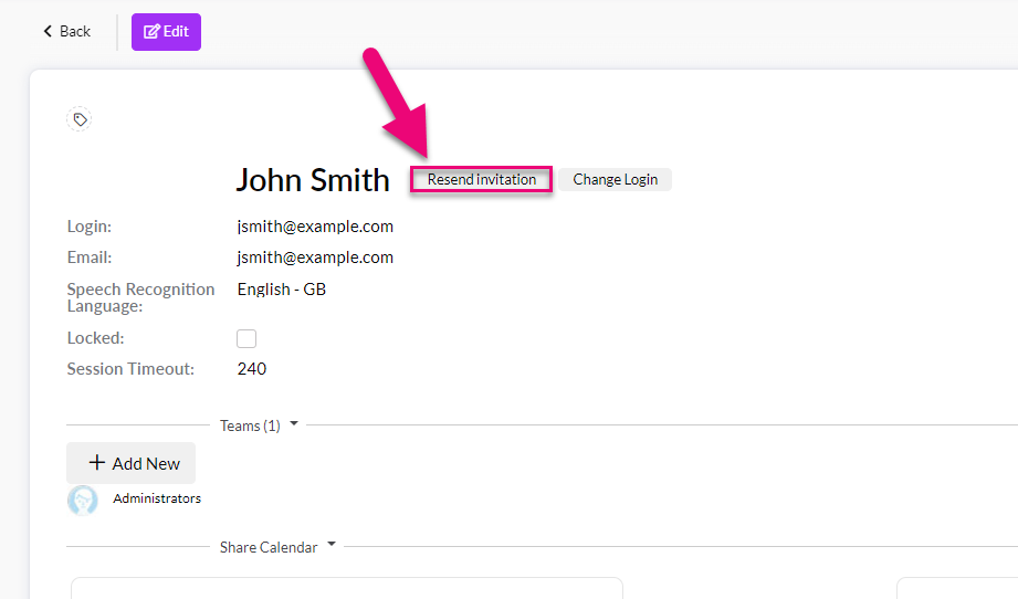- Simply click on the Resend invitation button – this sends an email to the User with instructions on how to log in.