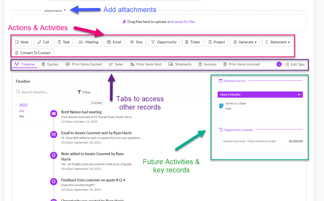 Scroll down and you will see an area where attachments can be added, a Timeline of activities, upcoming Activities and various tabs that provide access to the customers related records all over CRM.