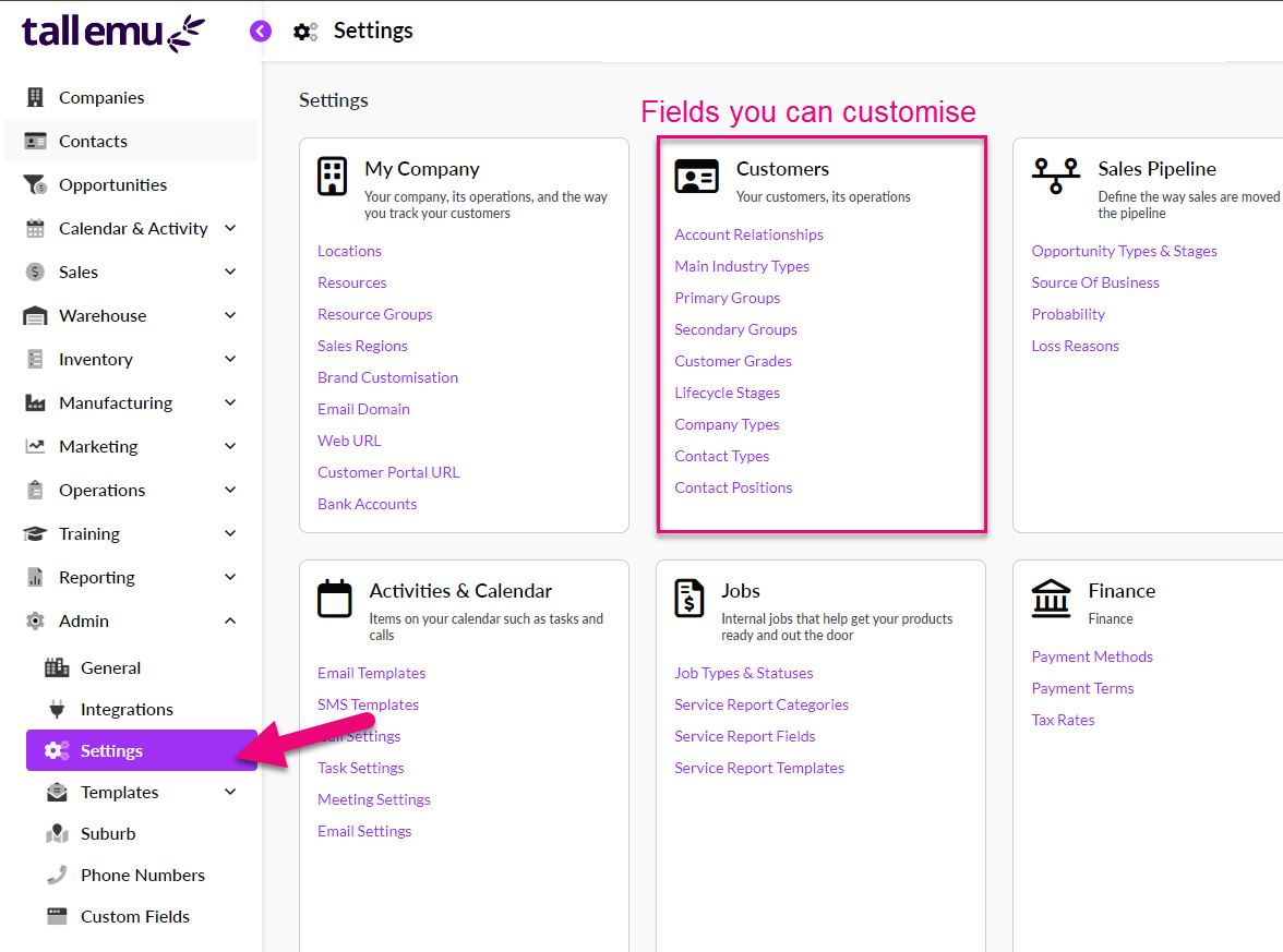 On the main menu, go to Admin > Settings > Customers – this is a list of fields that you can customise with your own options and terminology.