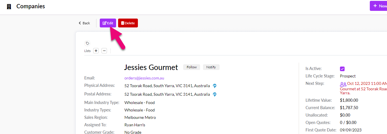 You can access examples of both from the main menu by clicking on Companies or Contacts, which will display a list of sample records.