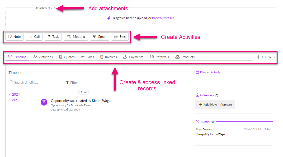 The bottom half of the form contains an area to add attachments, an action bar and tabs to create and access linked records.
