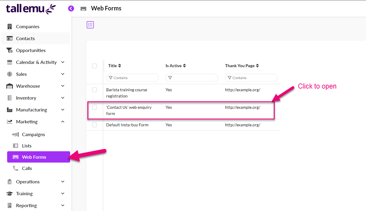 Go to Marketing > Web Forms and click to open the form called “‘Contact Us’ web enquiry form”.