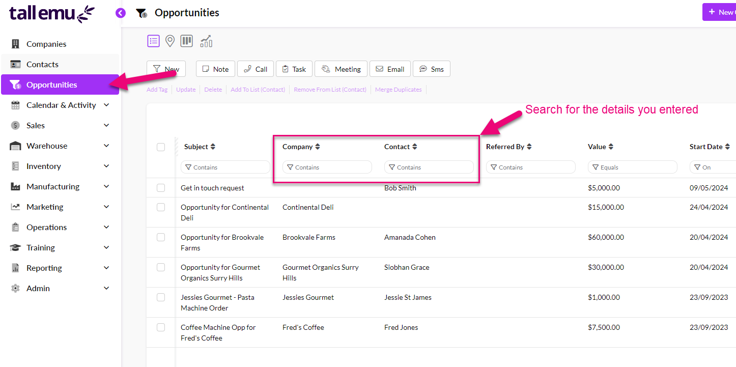 You will see that all the details you entered online have been brought into CRM – just click on the Company and/or Contact name to open the associated records.