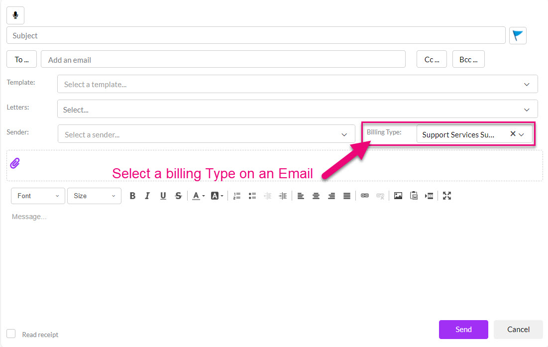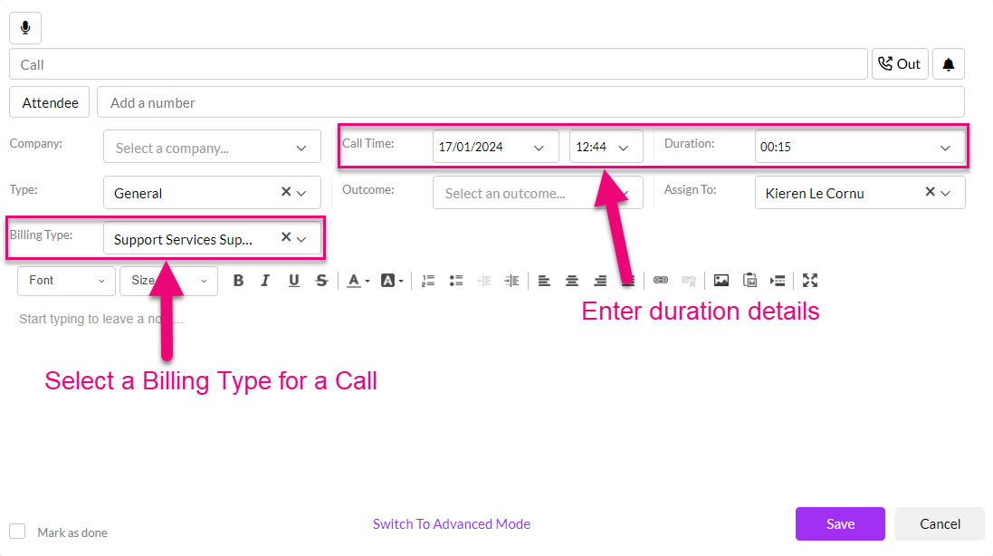 Emails and SMS work a little bit differently – in the earlier step when you configured the Time Billing settings in Admin > General, the Default SMS/Email Billing Duration figure you entered will be automatically applied to both these types of Activities.