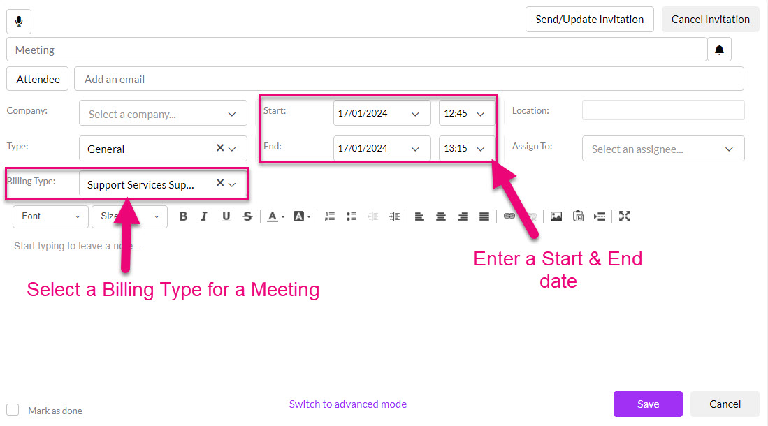 Note that the amount of billable time spent will be calculated based on the sum of the related Time entries and not the Start and End times entered on the Task.