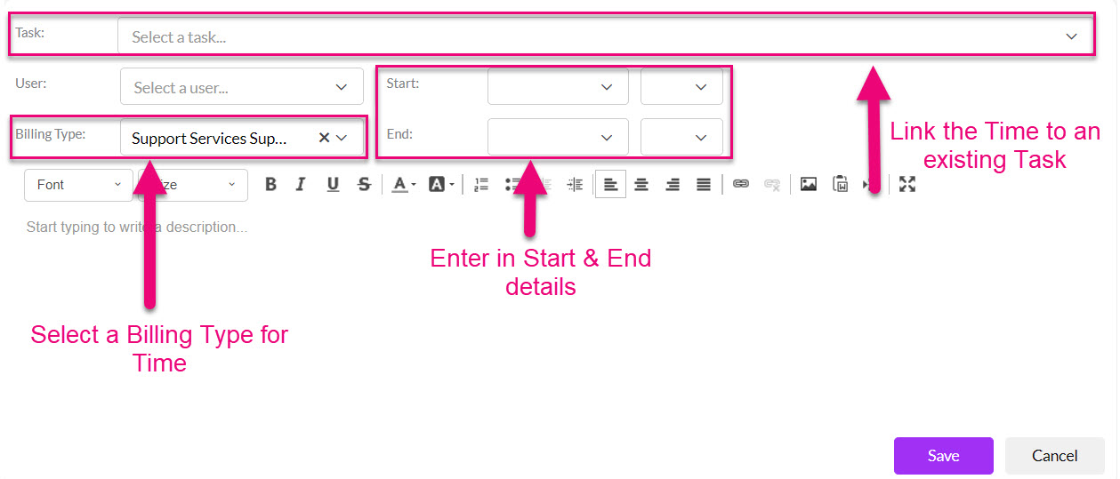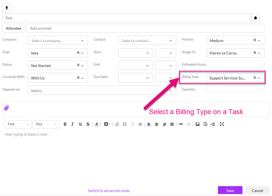 When you select a Billing Type for a Task, all Time entries that you create will default to the same Billing Type that you’ve chosen for the Task.