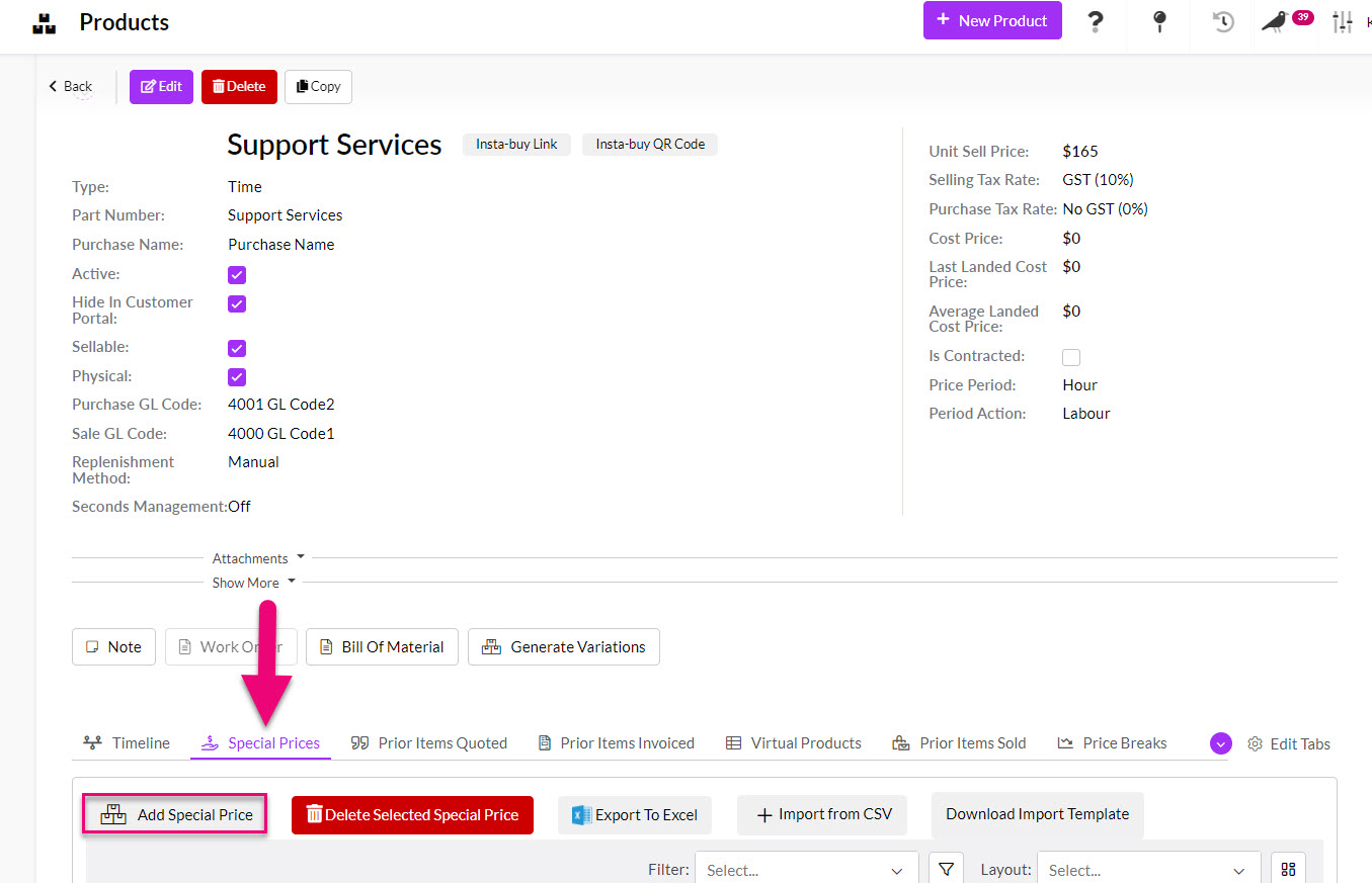 To set up different billing rates for your customers, open any Time Product that you have created for billing and click on the Special Prices tab and click on Add Special Price.