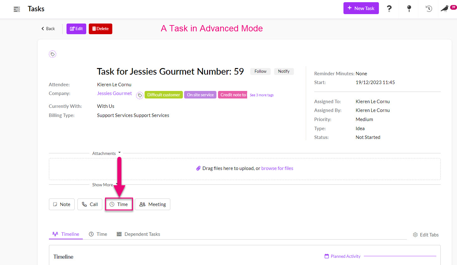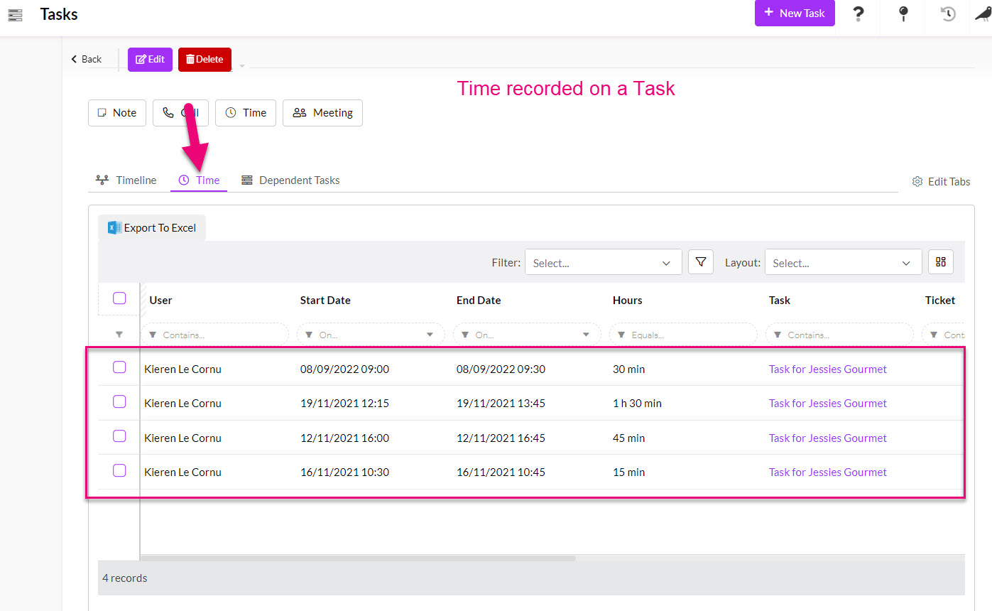 Tasks work in conjunction with Time – you can have multiple Time entries that are added up to determine the total time spent on a Task. Click here to learn more about how to work with Tasks.