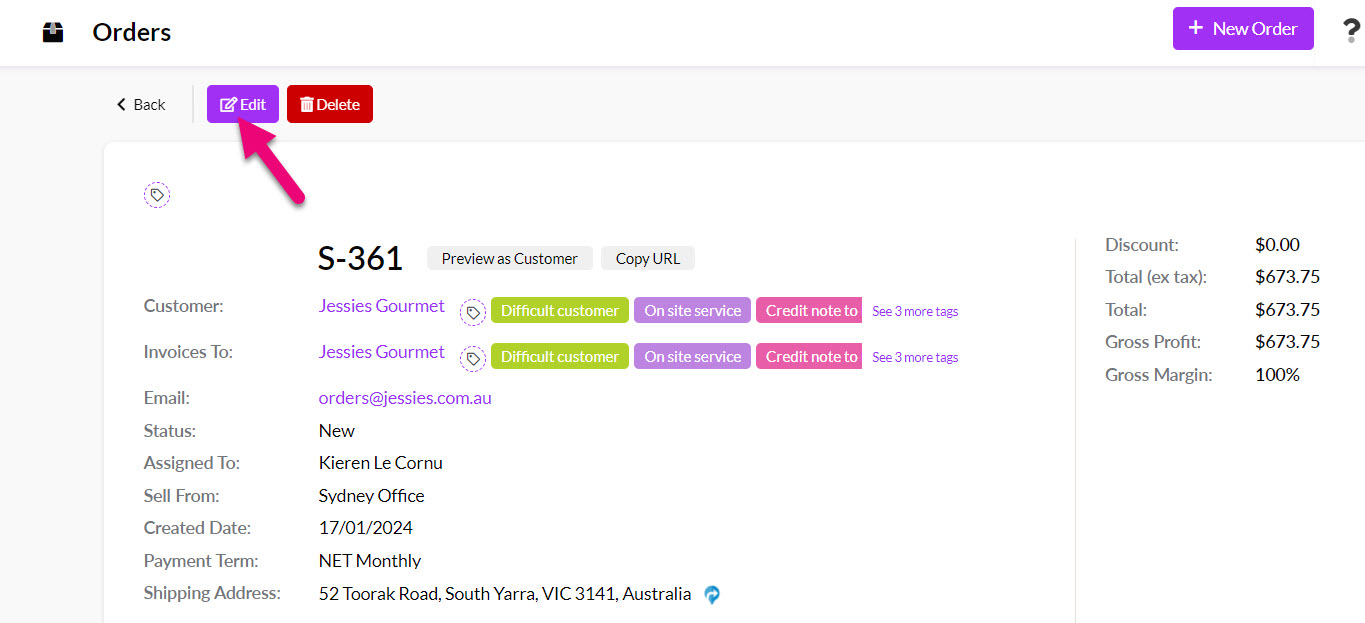 If you want to edit the items (to say override a charge), click Edit at the top of the record and make your adjustments then click Save & Close.