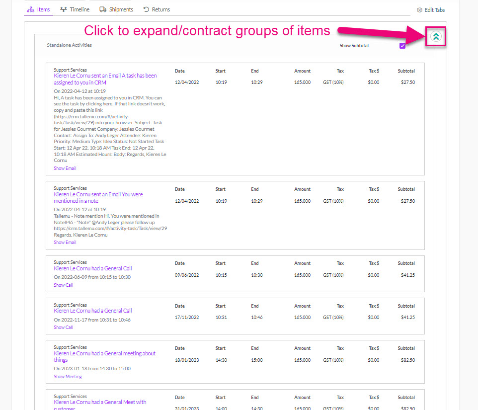 I can then expand the items on the order to see more detail about what is being billed – just click on the green arrows to expand or contract the list.