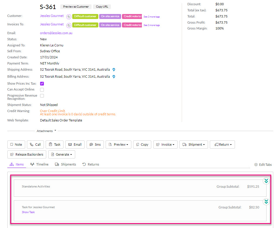A Sales Order will then be generated, and you will be taken straight to the record which will display all Activities that have not been previously billed i.e. if the Activities have previously been billed, they cannot be billed a second time unless they are removed from the original bill.