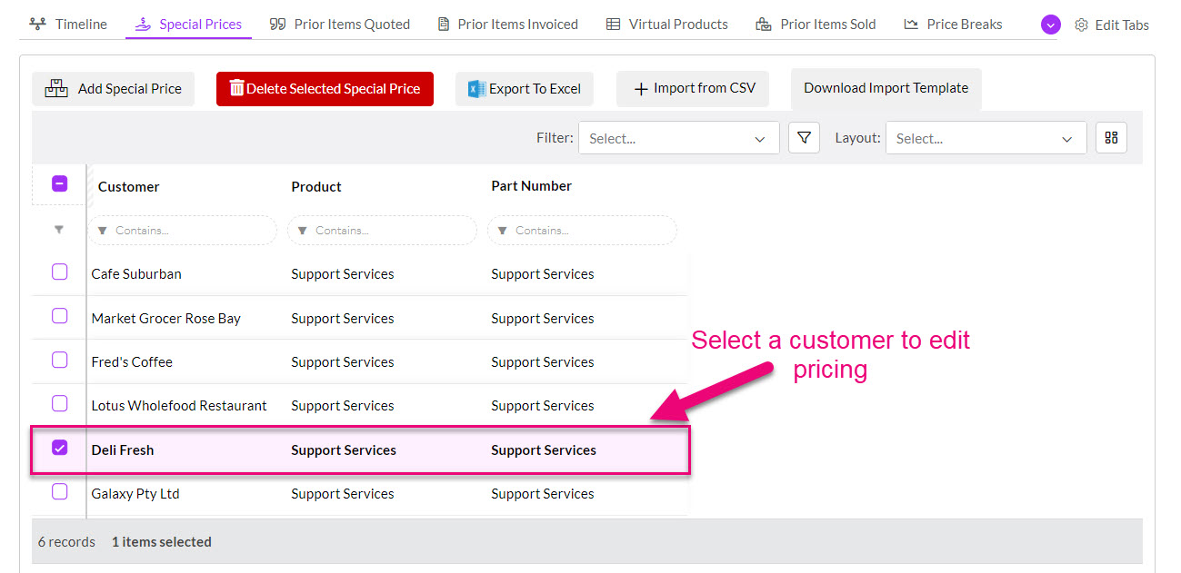 You can then continue the process by clicking on each customer you added to the Special Prices tab to set their billing rates.