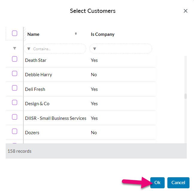 A window will open allowing you to select the customers you want to set up different billing charges for – click on OK when you have selected the applicable customers.