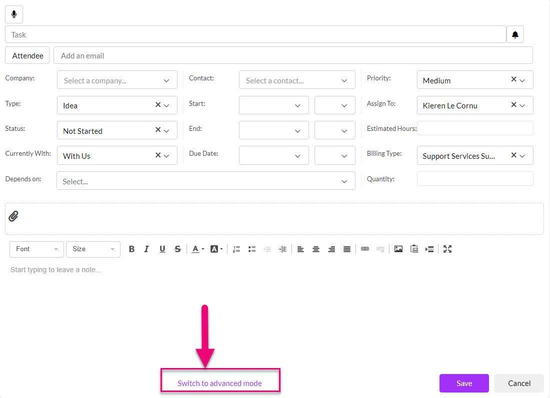 Note that the amount of billable time spent will be calculated based on the sum of the related Time entries and not the Start and End times entered on the Task.