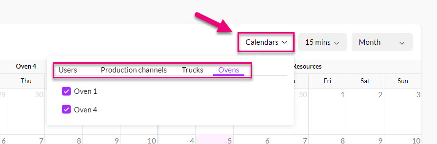 You can select which calendars are visible by clicking on Calendars to show a list of Users and Resources to select from – then use the checkboxes to select which calendars you want to display.