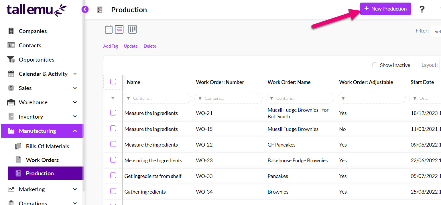 Adding Production Steps means that you’ll be able to use the Production area in Manufacturing and also use the Time Tracker for stop/start production tracking.