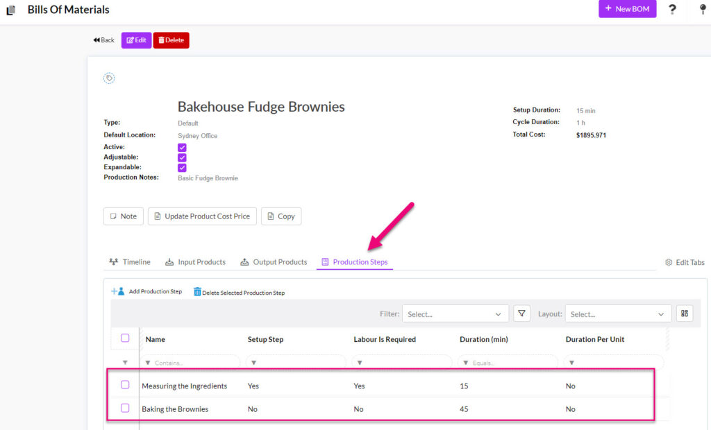 When you set up a Bill Of Material, you specify the items that you’re going to use and create during a manufacturing process. At the same time, you can specify the steps that need to take place in that manufacturing process – these are Production Steps. They are optional.