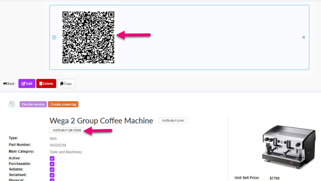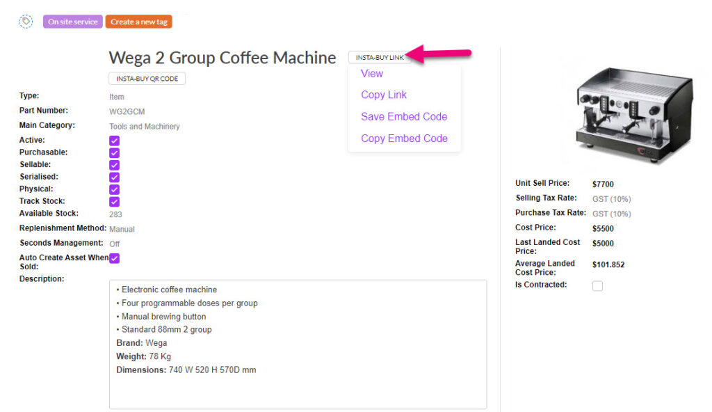 - We also have pre-built forms that you can use, straight out of the box – these are Insta-Buy Web Forms. Open any product in your inventory and you’ll see 2 buttons that allow give you links to an online form to sell that product online: Insta-Buy Link and Insta-Buy QR Code. Have a play around with this feature and buy a product from yourself online.