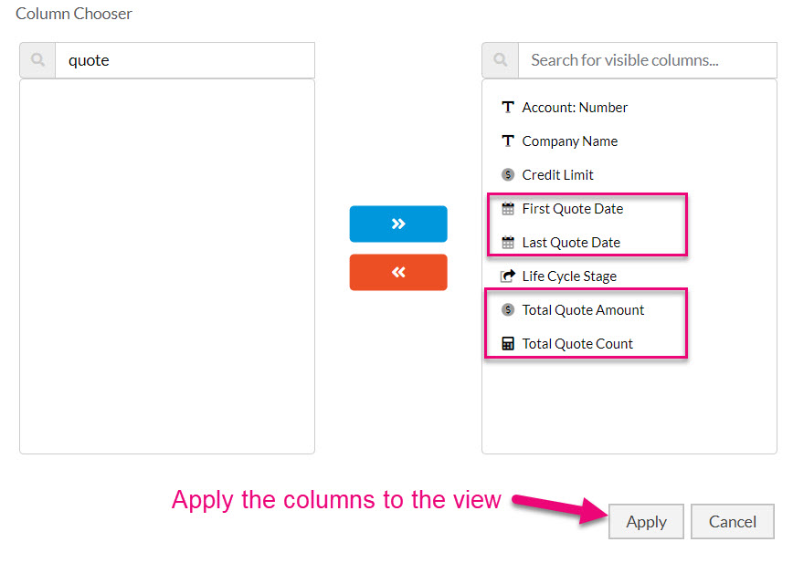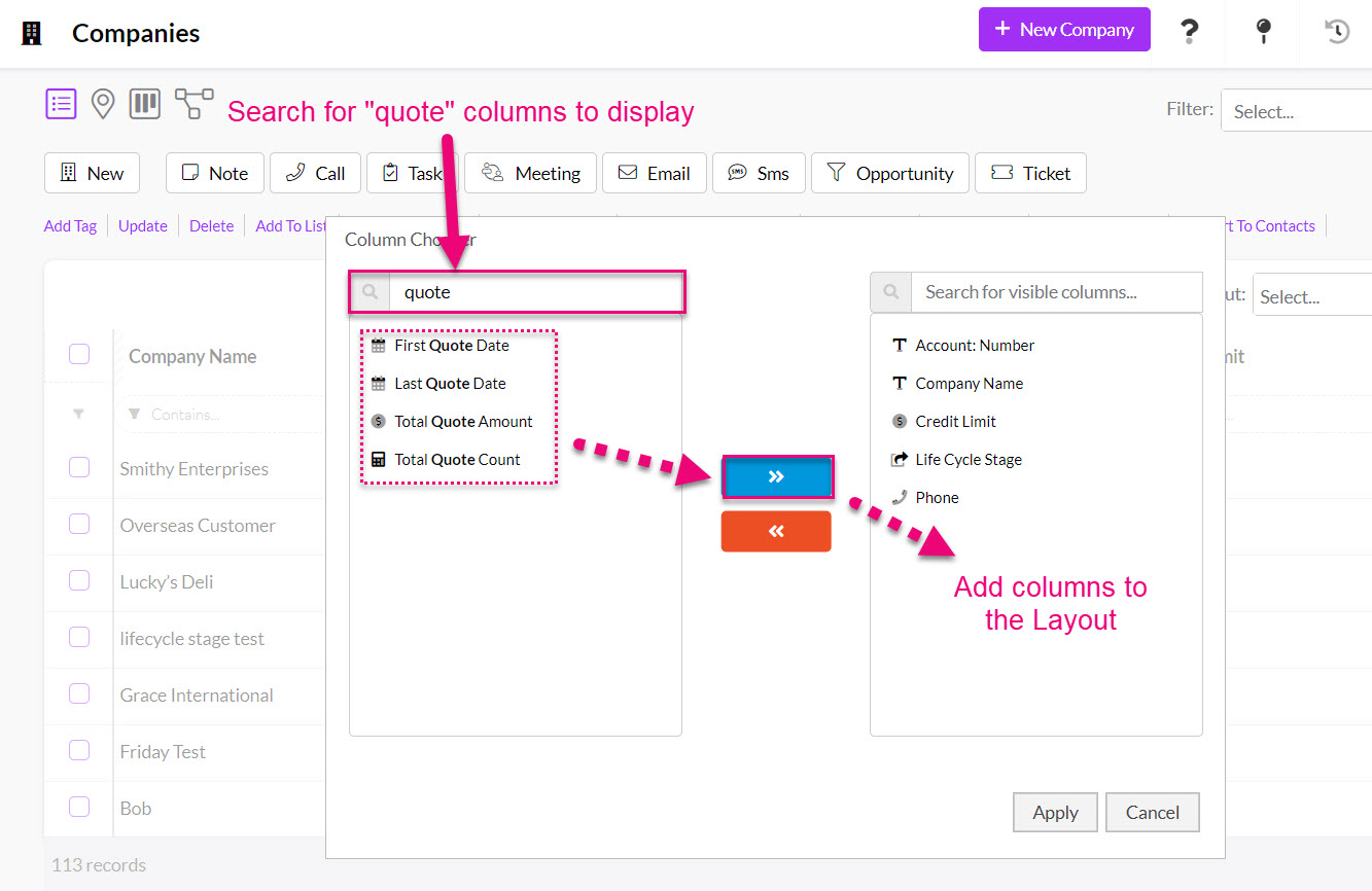 - In Companies and Contacts you can use the search box to find useful columns to display; in this case we will search for anything with the word “quote” in it, which brings up 4 columns that can be added to the view.