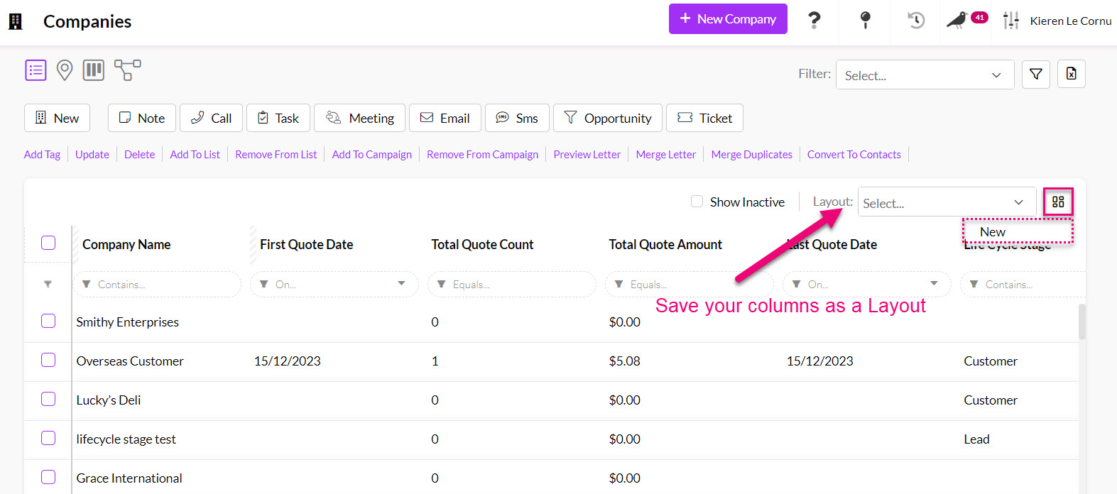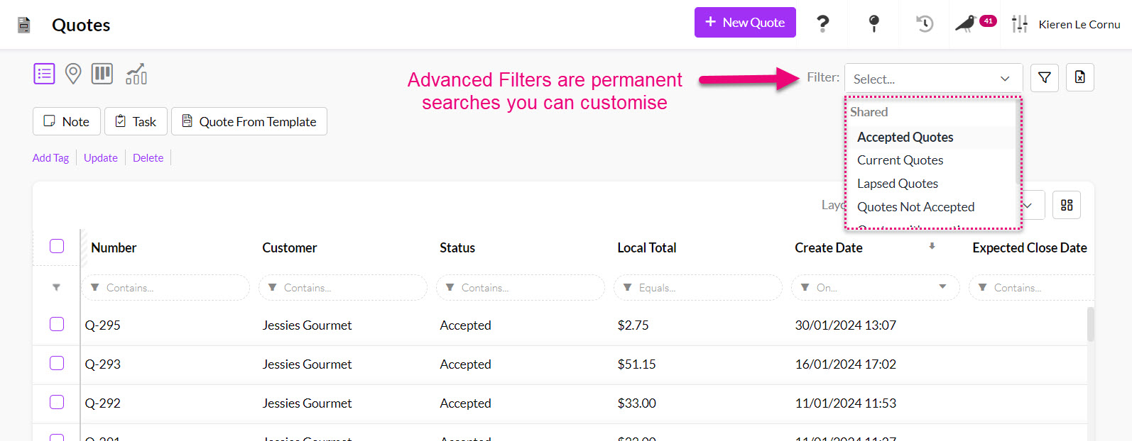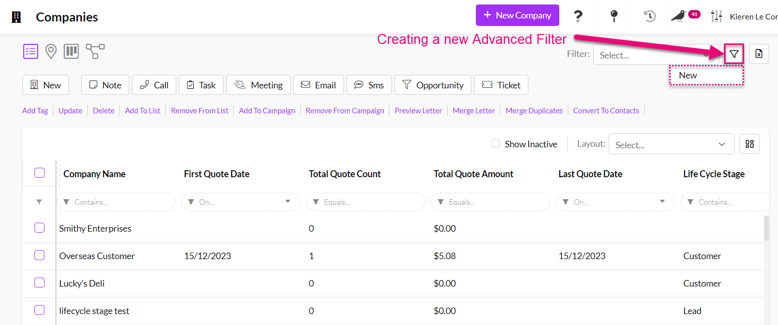Using Advanced Filters and Layouts you can create customised searches in Quotes, Companies and Contacts to quickly and easily segment your data for workflow and reporting.