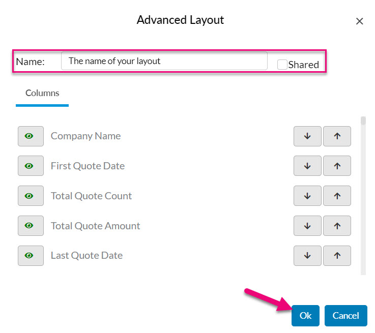 - Once you have the columns you want, in the order you want, you can now save this as a Layout.