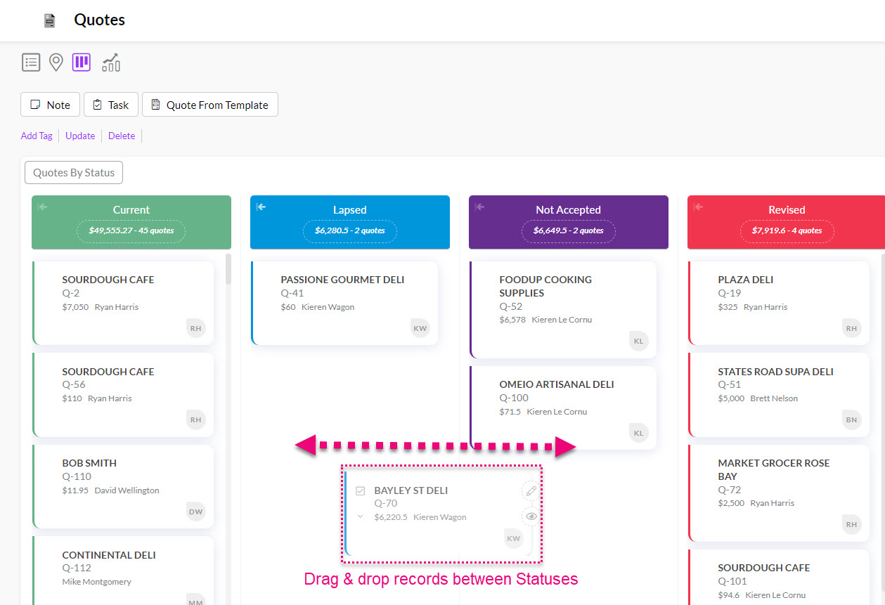 - You can also drag & drop Quote records into a different Status from Kanban view.