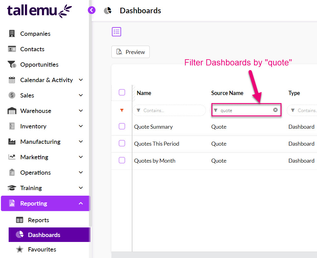 - You can also access all Dashboards for Quotes from Reporting > Dashboards – just run a quick filter on “quote” the in the Source Name box.
