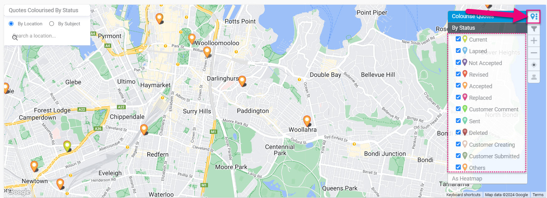 - From map view you can visualise each Quote at the customer/lead’s physical address – just click on the map pin icon in the view selector at the top of the screen.