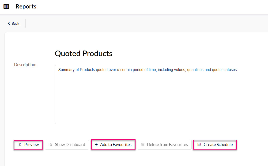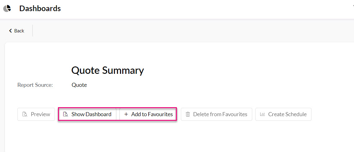 - Click on any record to open a screen that provides the option to view the Dashboard, add it to your Favourites list or send it out on a schedule.