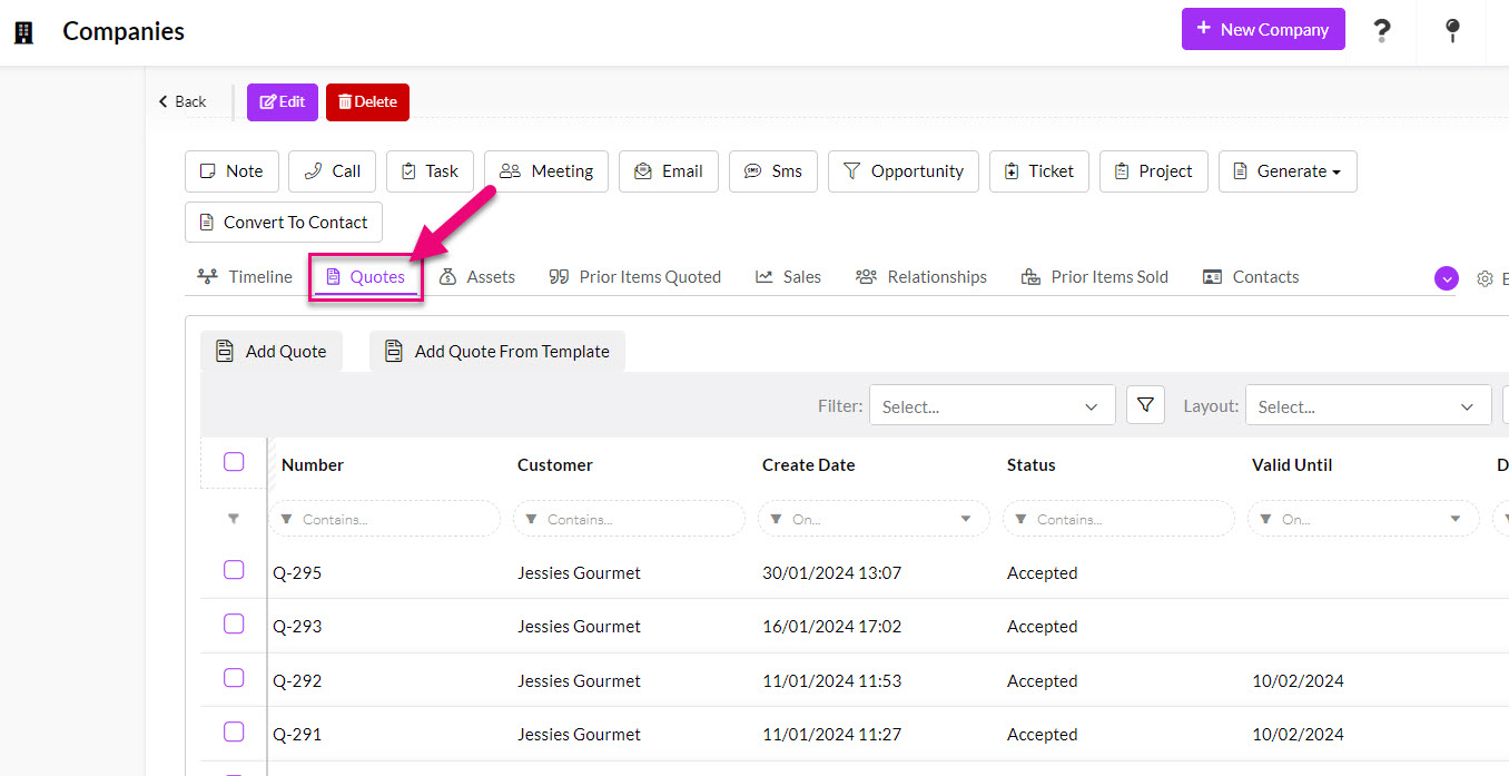 - From the Quotes tab you can see all current and previous Quotes for that customer (Contact or Company).