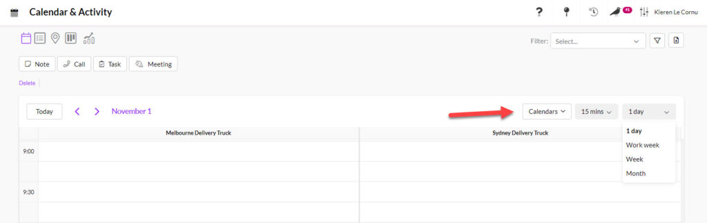 - You can also add & remove calendars from view for Users and Resources by clicking on the Calendars dropdown field.