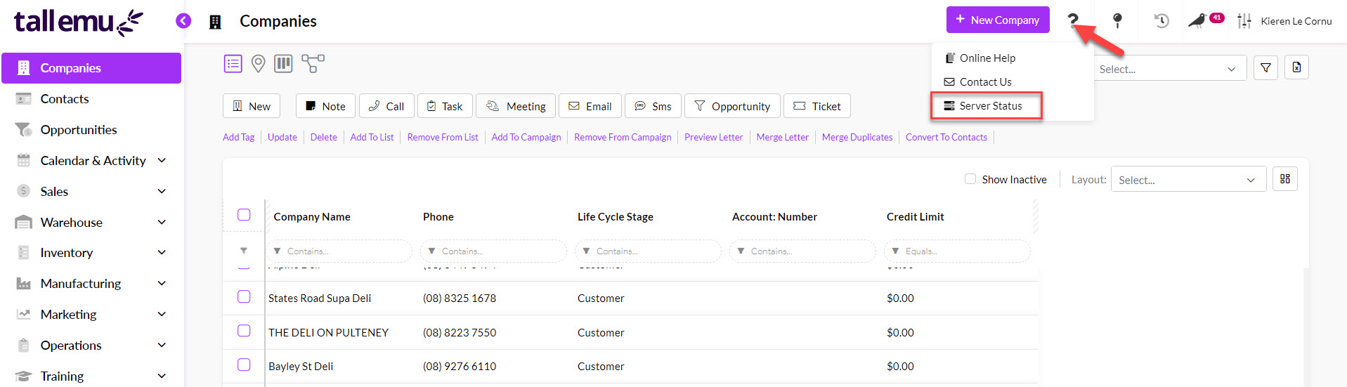 - The addition of a Server Status option to the “?” help menu in CRM.