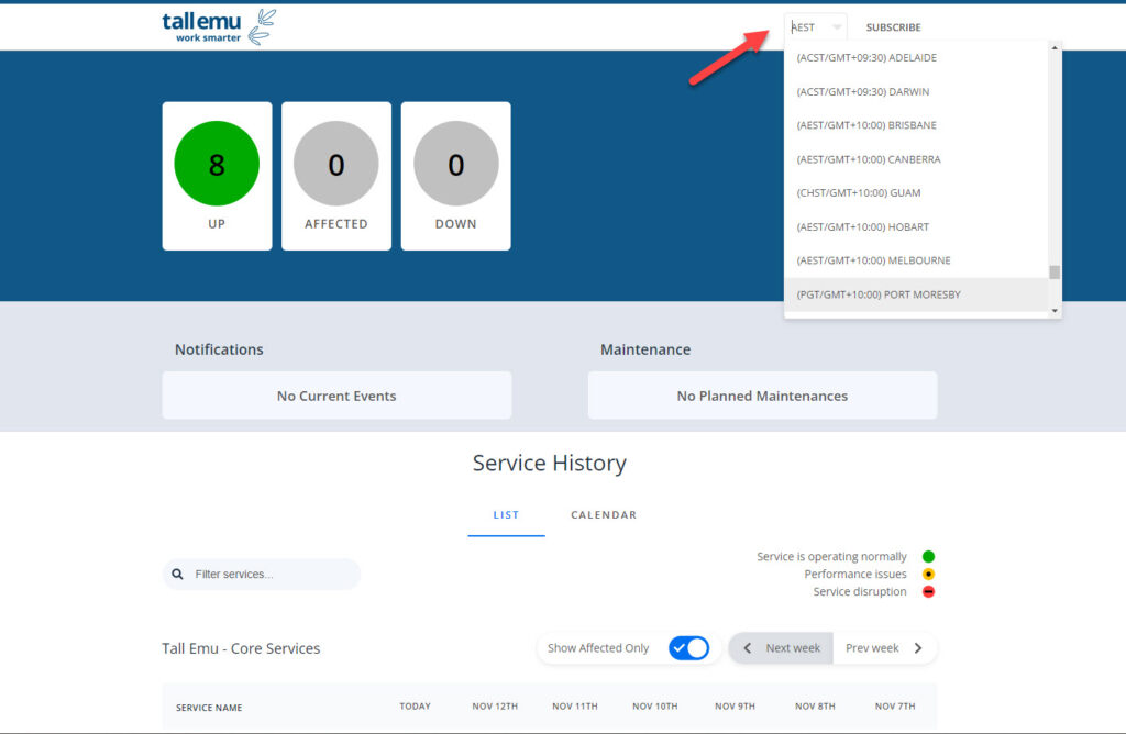 - Clicking on the new option will take you to directly to https://status.tallemucrm.com/ which shows you the current status of all CRM services. You can click to change the site to your local time zone, as shown in the following screenshot.