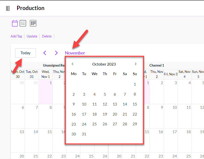 From Calendar View, you can schedule production with Users or Resources.
