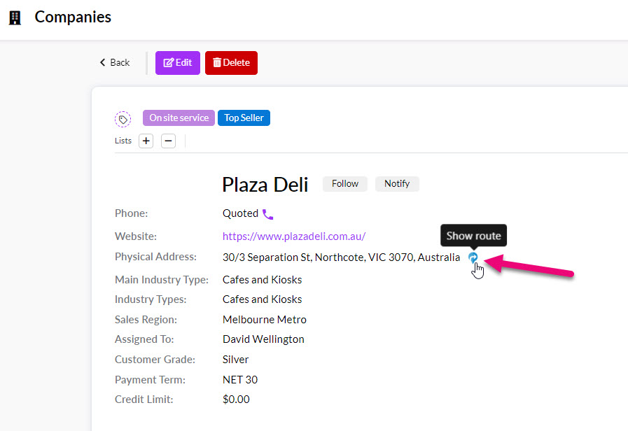 Every address in the CRM has a clickable “Navigation” link – click to open the record on the map.