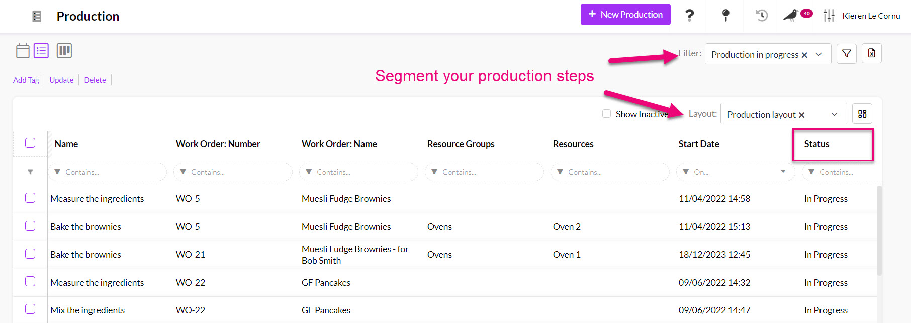 You’ll also want to set up Advanced Filters & Layouts in Manufacturing > Production so that you can segment all your Production Steps by things like Status.