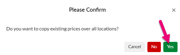 - Then confirm that you want to copy over prices to all Locations.