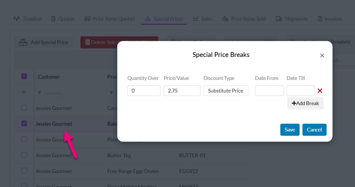 - From this screen you can set up quantity breaks and also date ranges on prices for a customer.