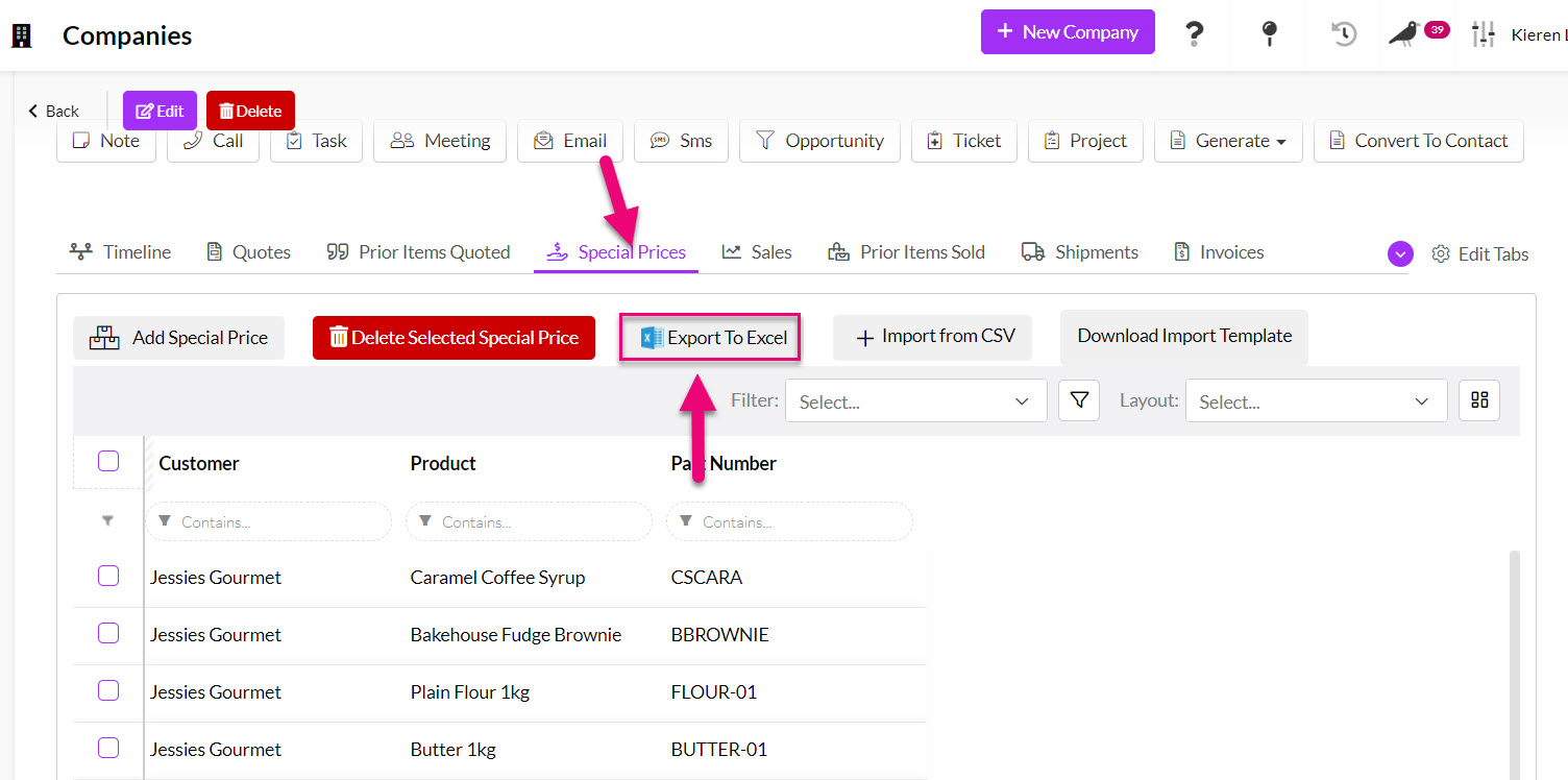 - From Companies or Contacts open any customer record and go to the Special Prices tab.