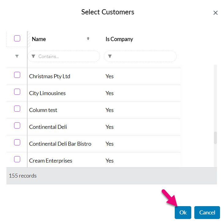 - Select as many customers as you require from the list and click on OK to proceed.